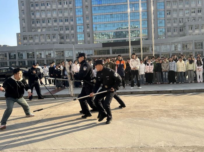 下午3时,演练在善德楼前正式开始。民警首先为师生详细讲解并演示了防暴盾、防暴叉、催泪喷射器等装备的正确使用方法,强调“防御为先、控制为主”的安全原则。在随后的模拟实战环节,由一名民警扮演“危险人员”,民警与学校安保人员协同运用防暴器械,迅速、稳妥完成处置,全程紧张有序,展现出良好的战术配合与应急反应能力。