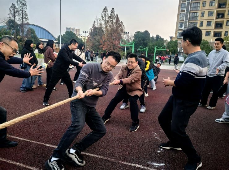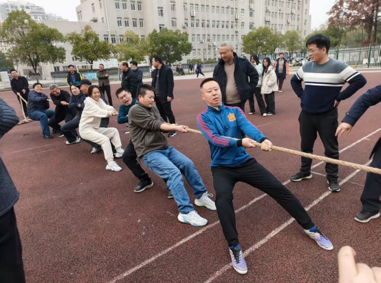 拔河赛场上,随着裁判员一声哨响,激烈的拔河比赛正式开始!比赛采取三局两胜制,各参赛队伍紧握绳索、身体后仰、双脚抓地,齐声呐喊;场外老师和学生们加油鼓劲。每一声口号都彰显出团结的力量,每一张笑脸都传递着对集体荣誉的追求。在激烈的角逐中,双方队员咬紧牙关,互不相让,将力量与意志完美融合,展现出极强的团队凝聚力。