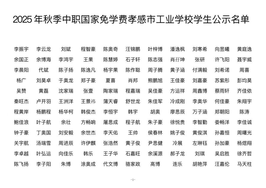 2025 年秋季中职国家免学费孝感市工业学校学生公示名单